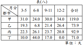 Posted in 會考109社會 會考社會109會考社會試題_34 表(八)為北半球四個都市的年平均降水日數統計,根據表中資訊判斷,何者最可能位於熱帶莽原氣候區? (A)甲 (B)乙 (C)丙 (D)丁 [單選題] 答案 (D) 題目與答案 加入最愛清單 加最愛