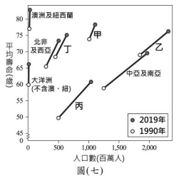 隨著醫療衛生的進步,人類的平均壽命正逐漸提高,圖(七)呈現1990年與2019年全球各區域平均壽命與人口數的變化,圖中未標示的區域有「中南美洲」、「歐洲及北美洲」、「東亞及東南亞」、「漠南非洲」。依據各區域的經濟發展及醫療衛生條件判斷,圖(七)中甲、乙、丙、丁何者最可能為漠南非洲?Image(A)甲