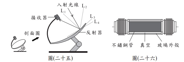 【題組:第47題到第48題】太陽能是一種再生能源,其中一種太陽能發電方式是使用如圖(二十五)所示的拋物面碟式收集器來收集太陽能。圖中的反射器可使太陽光會聚於接收器,加熱流經接收器內部的物質,進而達到發電的目的。