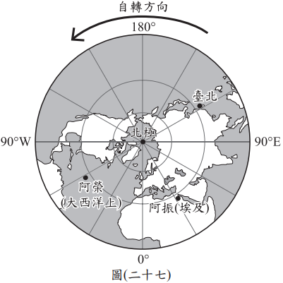 【題組:第49題到第50題】阿振與阿榮兩兄弟分別出國旅行,某日阿振在埃及Image旅行時走到了東經31.5度,北緯25度的某處,與臺北(東經121.5度,北緯25度)的經度正好相差90度;而同一時間的阿榮則位於大西洋上西經58.5度,北緯25度的某處,與臺北的經度正好相差180度,如圖(二十七)所示,兩兄弟相約拍下當天月亮的照片。若此時臺北當天所見的月相是滿月,則同一天內阿振與阿榮所在地的月相應最接近下列何者?