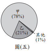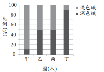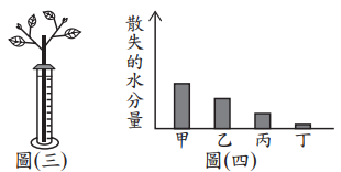 之後將甲、乙、丙、丁分別插入水位高度相同的量筒中,再把量筒開口處以膜 封閉,如圖(三)所示。將四組實驗裝置給予相同條件的環境,一段時間後記錄 量筒內散失的水分量,實驗結果如圖(四)所示。根據此結果,下列關於此株植 物氣孔位置分布的推論,何者最合理?