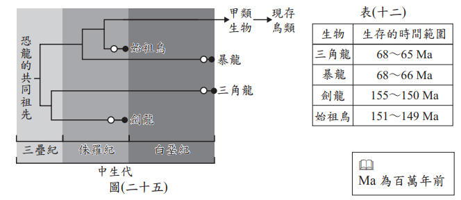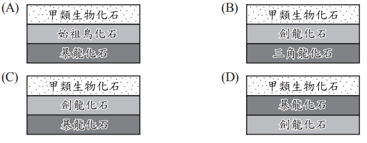 (D)於同一層火山灰岩層中發現劍龍與三角龍的化石