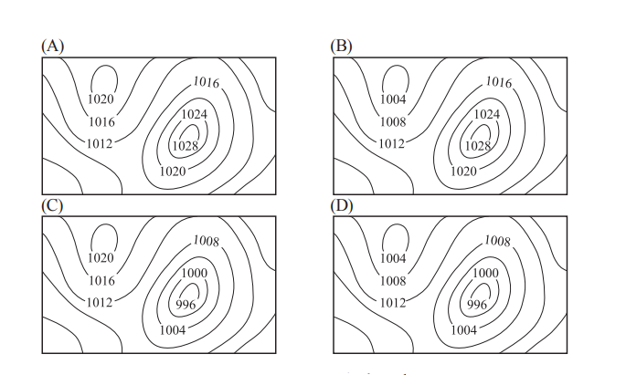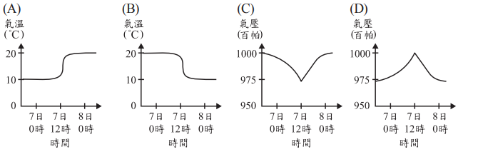 某次颱風通過一小島後,阿龍檢視了該小島在受颱風影響時的地面天氣觀 測資料,由某個觀測值正確推得颱風中心最接近該小島的時間點為該月的 7 日 12時。根據颱風中心的性質,下列何者最可能是他作出推論所利用的 資料?