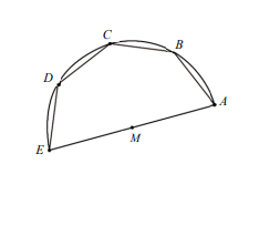 如圖,以 \(M\) 為圓心、\(MA = 8\) 為半徑畫圓,\(AE\) 為該圓的直徑,\(B\)、\(C\)、\(D\) 三點皆在圓上,且 \(AB = BC = CD = DE\)。若 \(MD = 8(\cos(\theta + 90^\circ), \sin(\theta + 90^\circ))\)。請選出正確的選項。