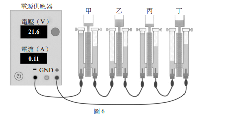 水電解反應所產生的氫氣(H2)與氧氣(O2),可分別作為燃料與醫療用途。為了瞭解電解質與電極材料對於水電解反應的影響,小安利用NaOH、Na2SO4、KNO3 與NaNO3 作為電解質,搭配白金、不鏽鋼與石墨作為電極,設計了一系列水電解實驗,並將結果整理成表3 與圖5;表3 為水電解實驗氣體生成體積,圖5 為水電解實驗的電流效率。電流效率表示所流通的電流中,有多少比例實際進行水電解反應。