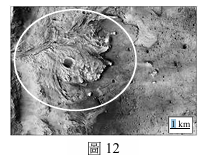 題組(28-29題)2020年7月30日美國太空總署探測車「毅力號」發射升空,並降落在火星表面「傑澤羅坑」邊緣一個富存黏土礦物與碳酸鹽的三角洲附近(圖12中的白色圓圈區域)。下列關於火星的描述,哪些正確?(應選2項)