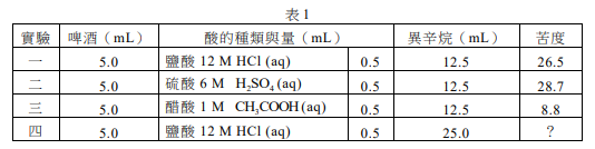 淑芬同學對某品牌的啤酒進行了四次的苦度測量,每次的實驗條件如表 1 所示。