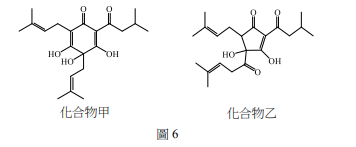 化合物甲與乙是啤酒苦味最主要的來源,其結構如圖6所示。在異辛烷溶液中,這兩個分子都會吸收波長275 nm的紫外光,且吸光度與濃度成正比。化合物甲與乙皆為弱酸,在水中可部分解離成H\(^+\)與它們各自的酸根。