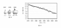 【第37-39題組】媽媽去購物商場買烤全雞,聽老闆說這些雞只需要約40天就達到上市的尺寸。近數十年,高產肉雞育種選拔計畫有著重要的突破,在持續的選拔下,以56日齡雞隻為例,可從1957年的905克/隻提升到2005年時的4202克/隻(如圖14所示)。此外,為降低飼養成本,育種過程也會參考肉雞的飼料轉化率,即肉雞每單位肉重所需的飼料重量(如圖15)。