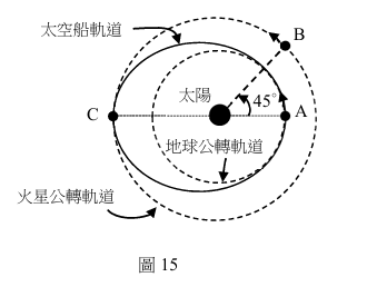 56. 2020年7月有3艘太空船從地球出發前往火星,此時地球在A處、火星在B處。太空船由火箭推動進入橢圓軌道後在重力下航行,如圖15所示,直到要與火星會合時,再進入繞行火星的軌道,最後於C處會合。已知火星公轉週期為地球公轉週期的1.9倍,則太空船由地球出發到與火星會合,所需時間最接近下列何者?